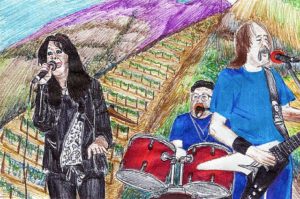 My latest example of ballpoint pen “sketchy behavior” was started two months ago…This one shows Blair County rock’n’roll trio Freedom Rocks as they provided the musical entertainment during a recent “Friday Wine Down” at Altoona’s Oak Spring Winery. Singer Jo Ann Nardelli, drummer Mike Nardelli and guitarist Vic Sabo perked up the wining and dining folk with their variety of rock’n’roll favorites spanning the 1960s through 1980s. They did early rock’n’roll numbers like Roy Orbison’s “Oh Pretty Woman,” the Isley Brothers/Beatles’ “Twist and Shout,” The Chantays’ “Pipeline,” The Crystals’ “Da Doo Ron Ron,” Kathy Young & The Innocents’ “1,000 Stars” and more; also classic rock gems from Stevie Ray Vaughan, Joan Jett, John Mellencamp, ZZ Top, Santana, Fleetwood Mac, AC/DC, Bachman-Turner Overdrive, The Doors and others. Freedom Rocks radiated fun through it all, prompting in-seat grooving and receiving nice cheers from the audience. They also inspired my ballpoint pens into action…Fun times!