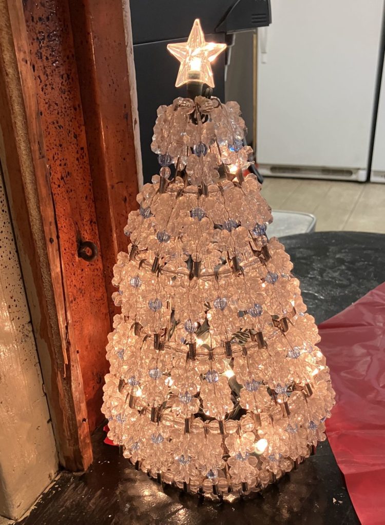 This smaller tree sitting on the counter is actually made from Safety Pins and beads on a frame