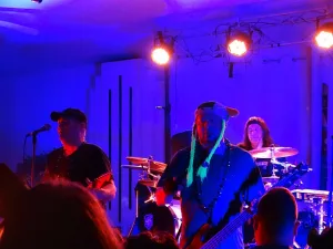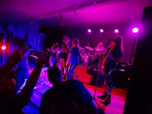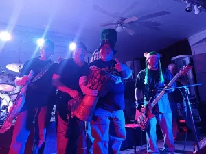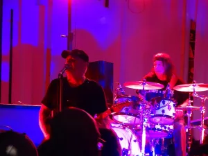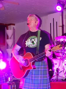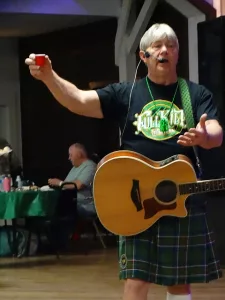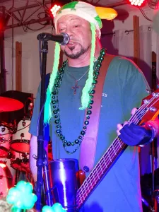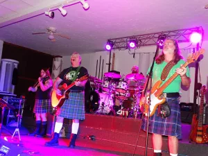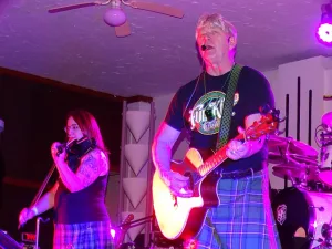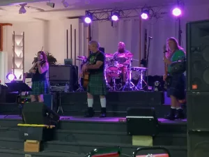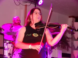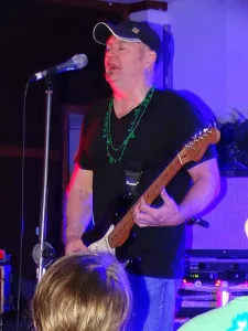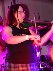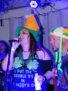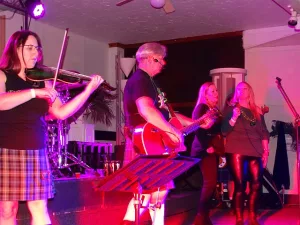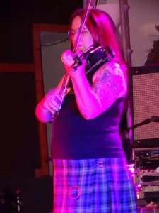 Many green-clad celebrants filled the ballroom once the doors opened, and a huge sea of green greeted openers Full Kilt as they took the stage. Fiddler Mandy Passmore-Ott took the spotlight early with the fiddle-driven instrumental opener, “Jameson Set” – kicking off Full Kilt’s two sets of Irish rock favorites, pub and folk songs. Mandy, singer and guitarist Mike Zerbee, bassist and singer Chris Myers and drummer Jake Yarnish did fun Irish pub and folk classics such as “Johnny Jump Up,” the accelerating “Mary Mack,” the clap-along favorite “Whiskey in the Jar” and more. They also did rocking Irish-flavored favorites such as Dropkick Murphys’ “I’m Shipping Up to Boston,” Van Morrison’s “Brown Eyed Girl” and “Wild Night,” and their “Irished-up” versions of Lynyrd (Mc)Skynyrd’s “Free Bird” and Charlie (Mc)Daniels’ “The Devil Went Down to Dublin, plus the ever-popular sing-along version of Smokie’s “Living Next Door to Alice.” And on a more serious note, Full Kilt devoted Flogging Molly’s ballad “If I Ever Leave This World Alive” in Dauber’s memory.