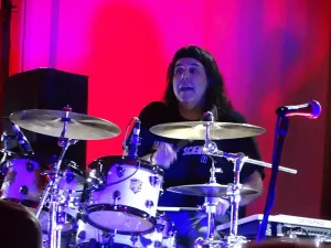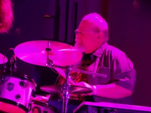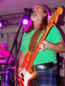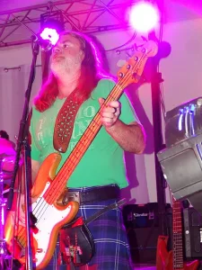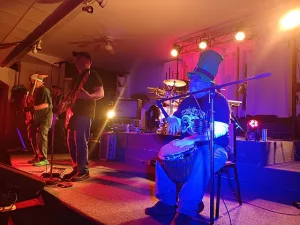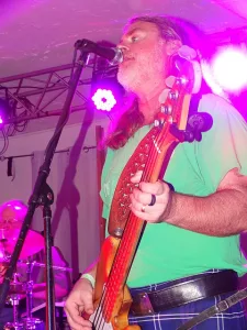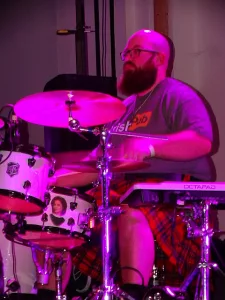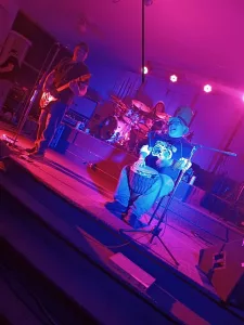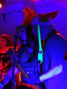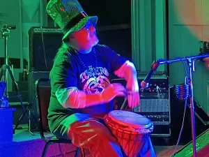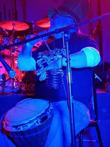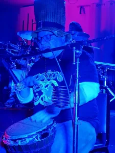 The pictures below show both bands and the merriment of this fun night. (Thanks to Denise Musser for taking the pictures of “The Professor” banging away on the djembe during Giants Of Science’s set!)