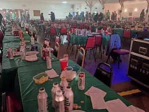 These photos document the evening from the arrival of the green-clad celebrants (including a happy green-clad Professor) to the dinner, both bands, the group photo of all the area firemen in the building, the basket giveaway, nonstop dancing – and the end of the night, as the tables show the evidence of a fun evening!