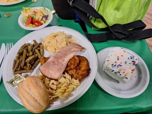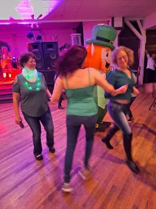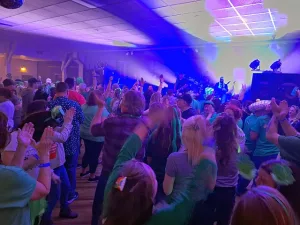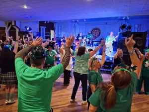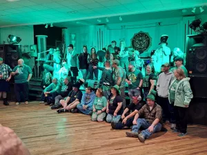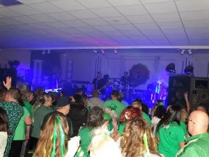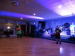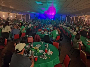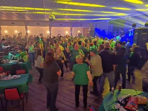 These photos document the evening from the arrival of the green-clad celebrants (including a happy green-clad Professor) to the dinner, both bands, the group photo of all the area firemen in the building, the basket giveaway, nonstop dancing – and the end of the night, as the tables show the evidence of a fun evening!
