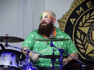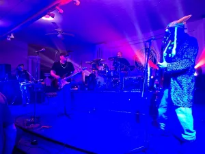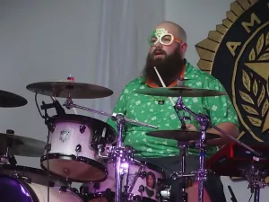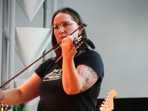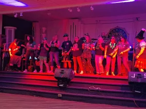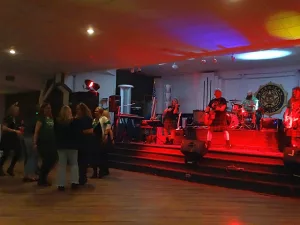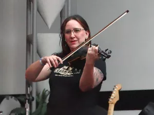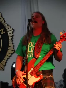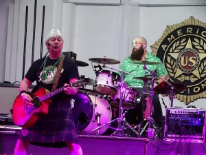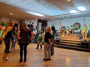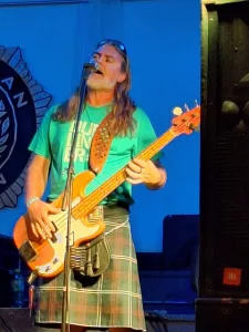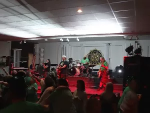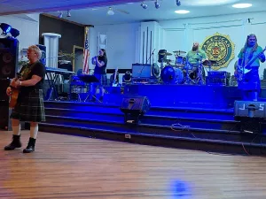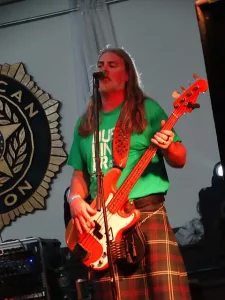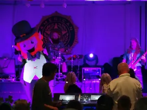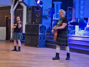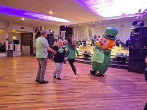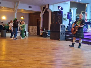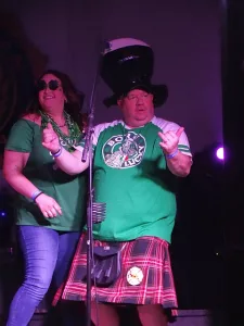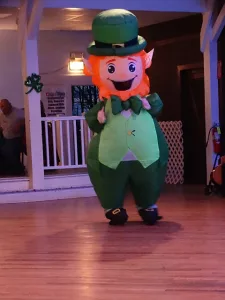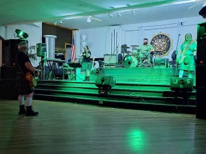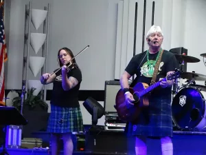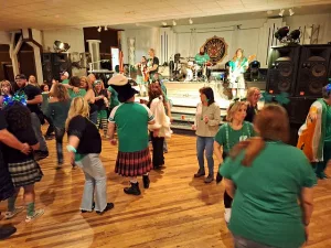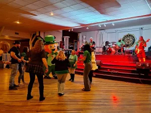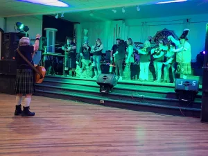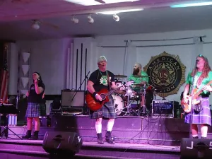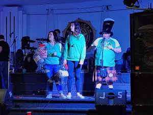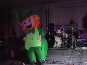 After dinner was served, Full Kilt kicked off the musical festivities with their spirited mixture of Celtic-flavored favorites, original songs, folk songs, fiddle tunes and more. Opening with their original number “Plastic Paddys,” singer and guitarist Mike Zerbee, fiddler Mandy Passmore-Ott, bassist and singer Chris Myers and drummer Jake Yarnish led the audience on sing-alongs, including their audience-dueling rendition of “Whiskey in the Jar,” their rowdy send-up of Smokie’s 1976 hit “Living Next Door to Alice,” Shel Silverstein/The Irish Rovers’ “The Unicorn.” They also did other Irish/Celtic folk and drinking songs such as “Johnny Jump Up,” “The Black Velvet Band,” “Irish Rover,” “The Night Paddy Murphy Died” and others; rocked with some Irish punk rock numbers such as Dropkick Murphys’ “I’m Shipping Up to Boston” and “Rose Tattoo”; and gave their own Celtic rock send-ups to renditions of “Wagon Wheel,” Queen’s “Fat Bottomed Girls,” Charlie (Mc)Daniels’ “The Devil Went Down to (Dublin),” Van Morrison’s “Wild Night” and U2’s “With or Without You.” The dance floor became busier and busier as Full Kilt’s performance continued, with a large leprechaun joining in on the fun during the performance’s latter stages.